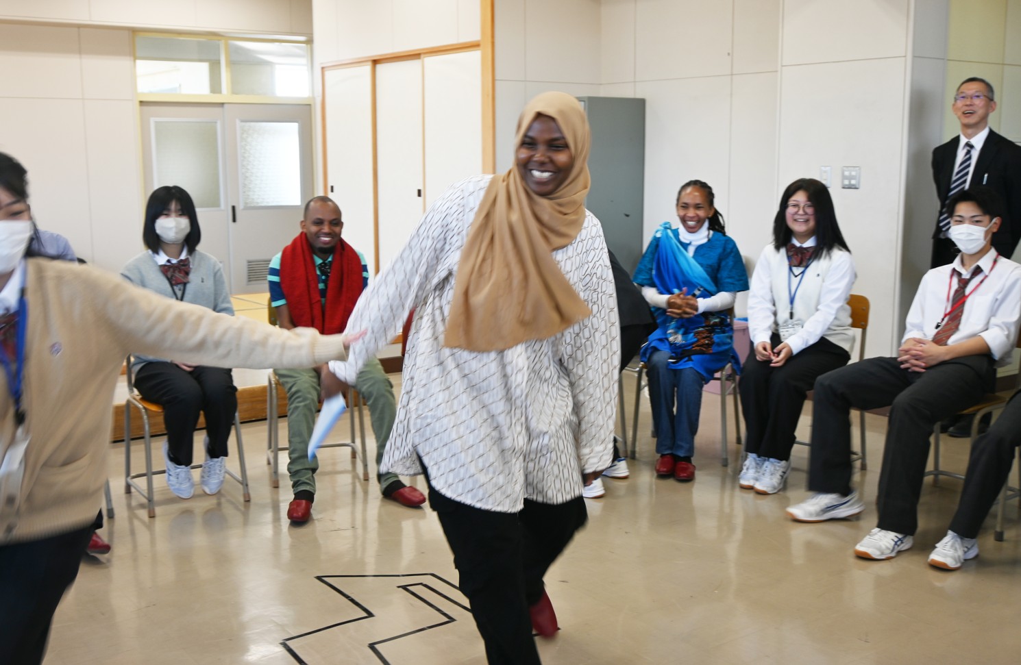 [写真/椅子取りゲームで交流を深める、生徒と研修員ら]