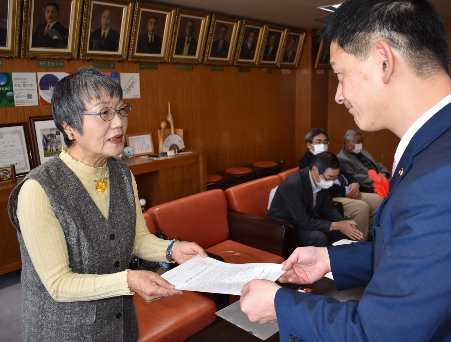 [写真/鶴間市長(右)に要望書を渡す川村代表]