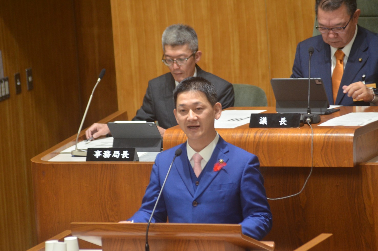 [写真/議会冒頭であいさつする鶴間市長]