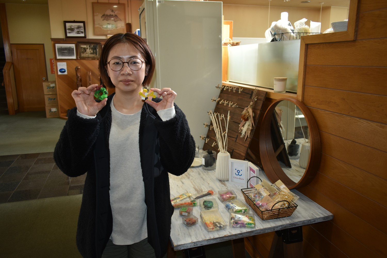 [写真/自身の作品を手に、マルシェをPRする堀内さん]