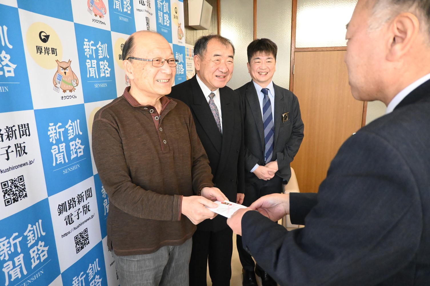 [写真/星匠釧路新聞社社長に寄付金を手渡す伊関会長(左)]