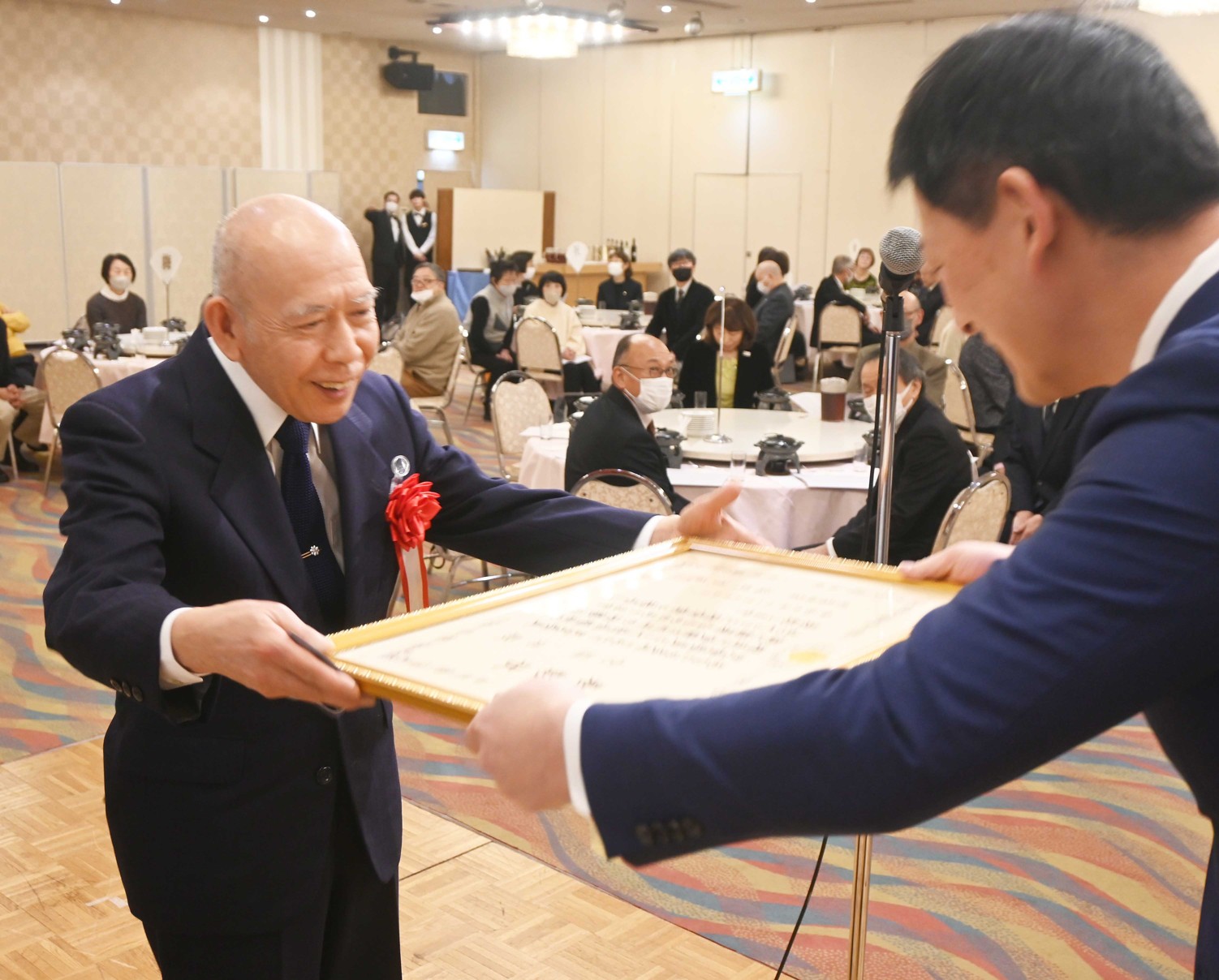 [写真/鶴間市長(右)から表彰状の伝達を受ける宮脇さん]