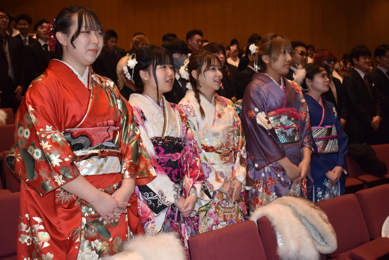 [写真/晴れやかな振り袖姿の参加者(根室市会場)]