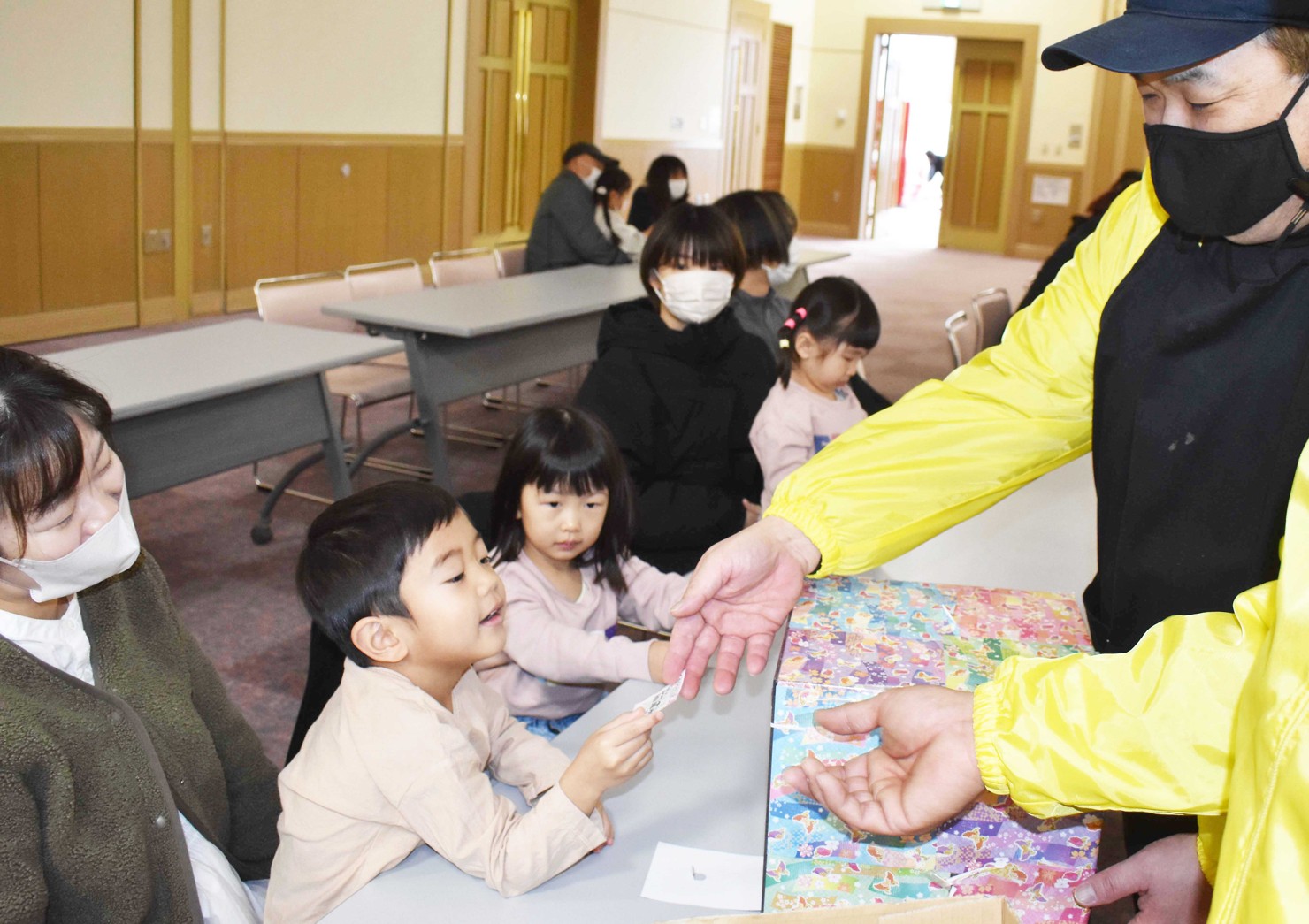 [写真/カウモン宝くじの当選番号が書かれた紙を引く来場者]