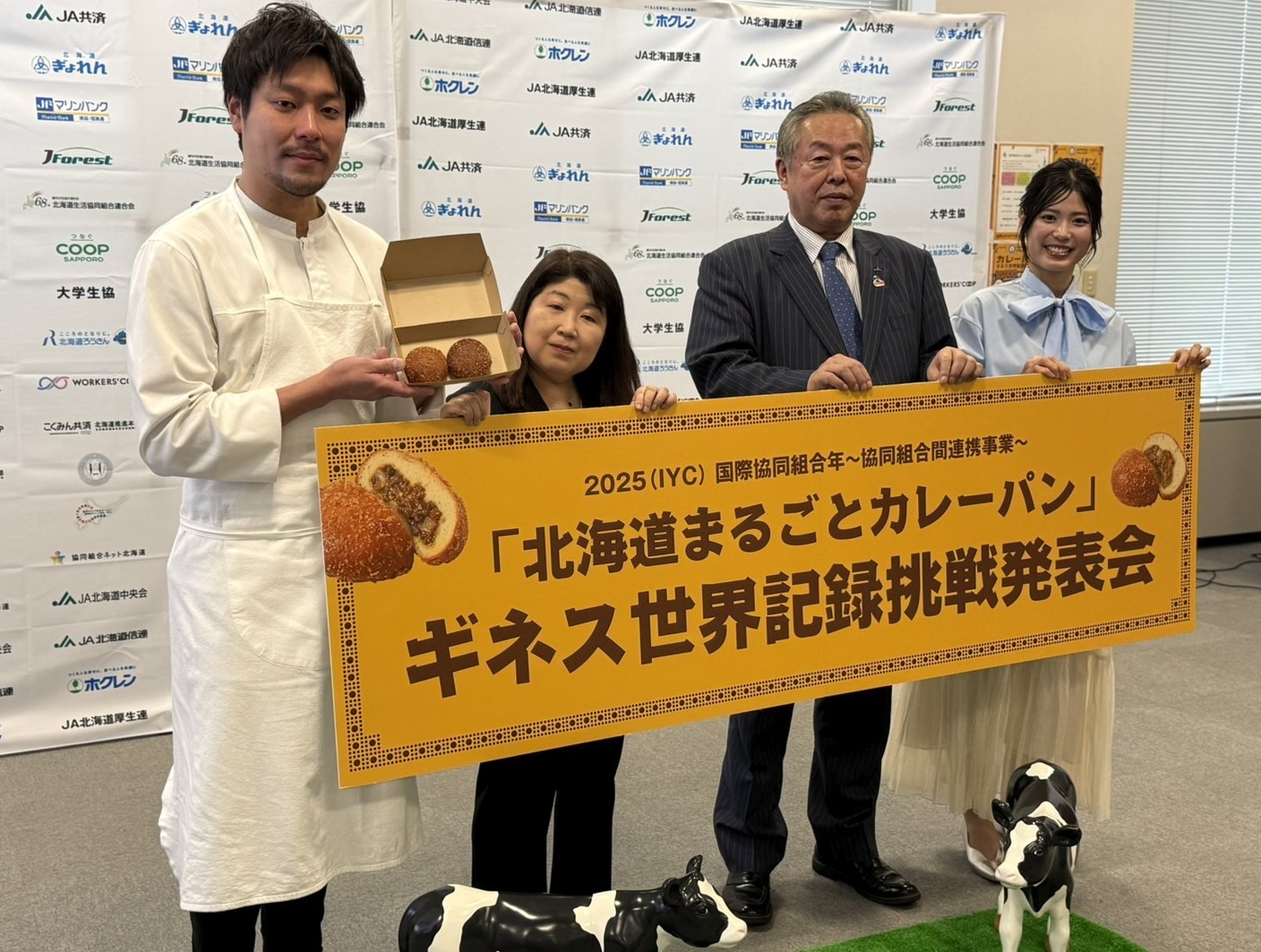 [写真/「カレーパンでギネスに挑戦」をPRする樽井JA中央会長(右から2人目)ら]