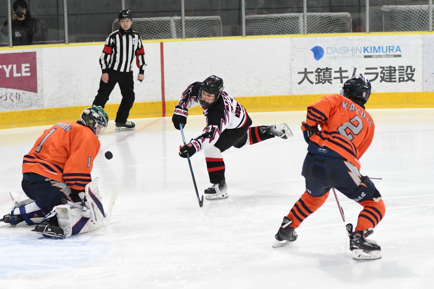 [写真/【準々決勝、武修館―北海道栄】第2ピリオド15秒にゴールを決めるDF松田。チームに流れを呼び込んだ(佐々木美香撮影)]