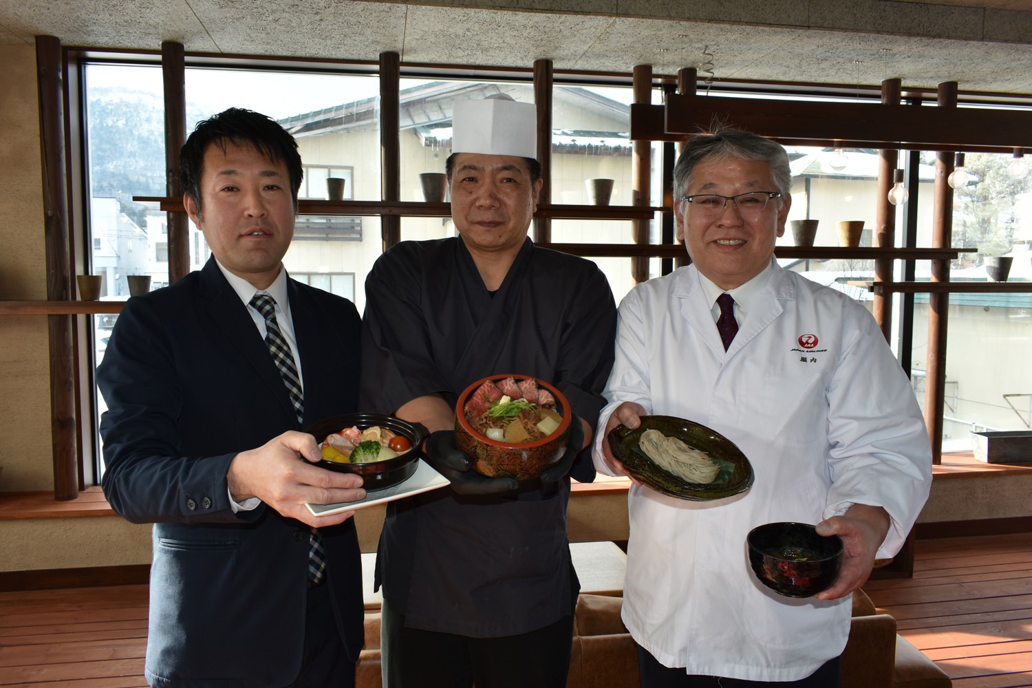 [写真/スノー・ホット・ポット、てしかが丼、湯けむりそばを手に榎本組合長と日下料理長、堀内シェフ(左から)]