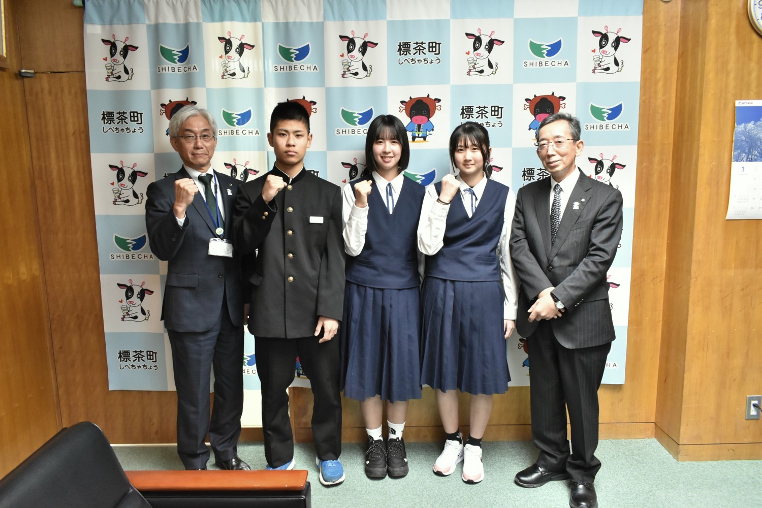 [写真/表敬訪問で青木教育長と松坂さん、笛木さん、今橋さん、佐藤町長(左から)]