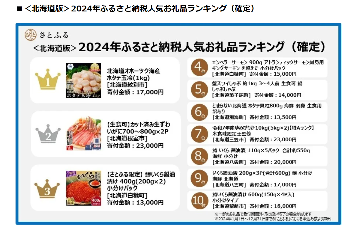 [写真/「さとふる」が公表した2024年全道版返礼品ランキング(ホームページより)]