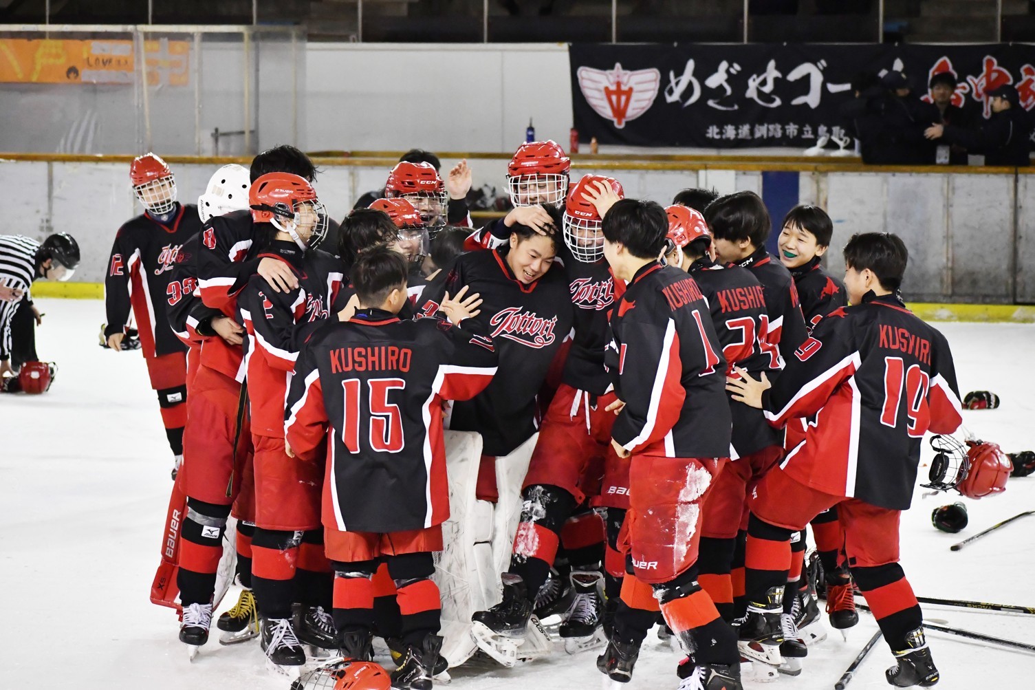 [写真/【決勝、釧鳥取─八戸第二】歓喜の輪の中心には2年生GKの杉本]