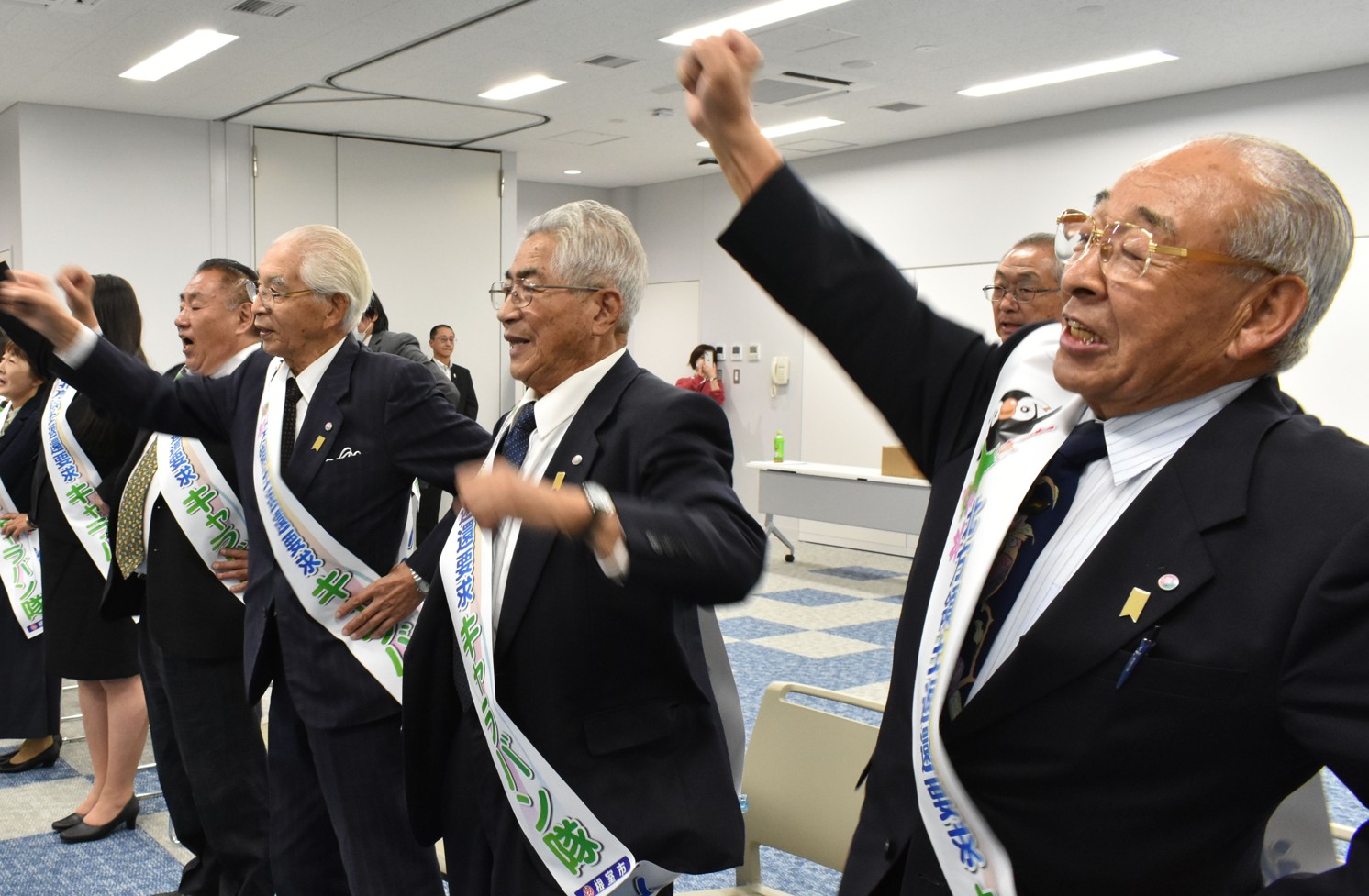 [写真/全国キャラバン出発式でガンバローと拳を上げる元島民(昨年10月、根室市)]