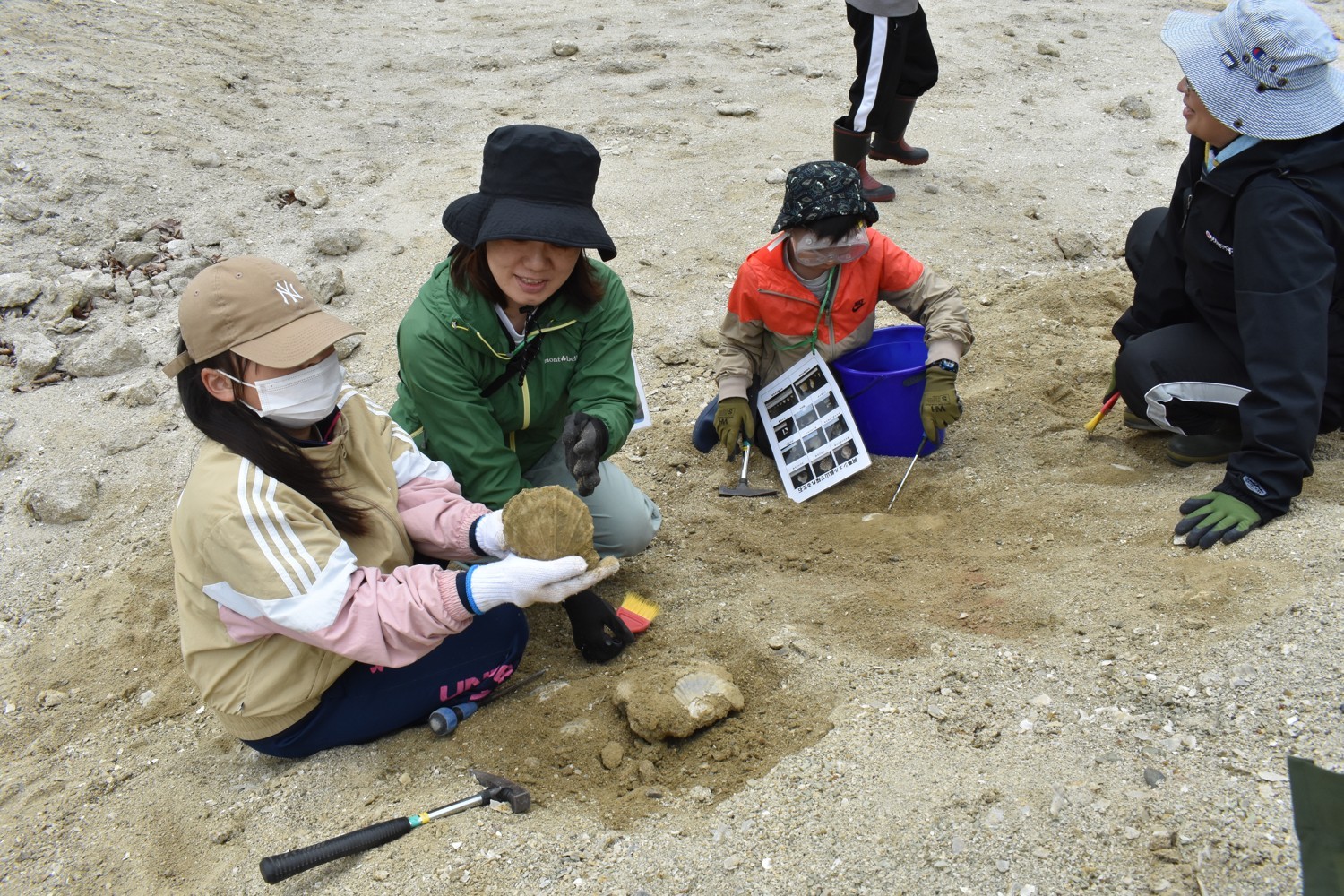 [写真/土の中からホタテの化石を掘り出した参加者]