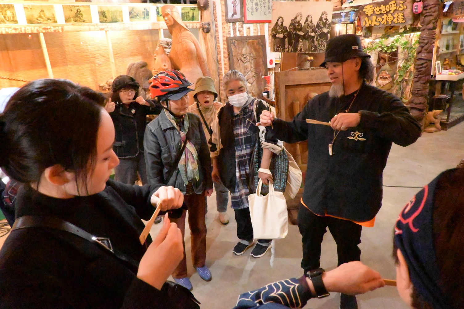 [写真/参加者にムックリの鳴らし方を説明するCHAZさん(右)]
