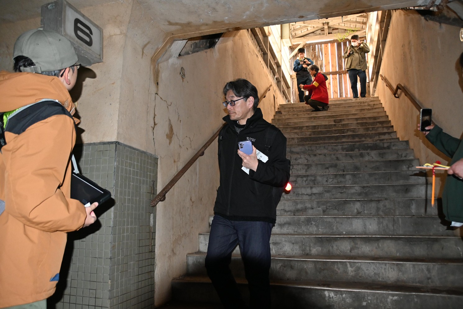 [写真/かつて存在した6番線ホームにつながる地下道を見学する参加者]