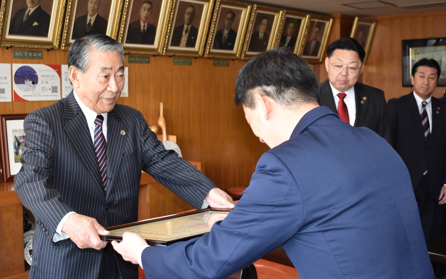 [写真/鶴間市長から紺綬褒章を伝達される中山会長(左端)]