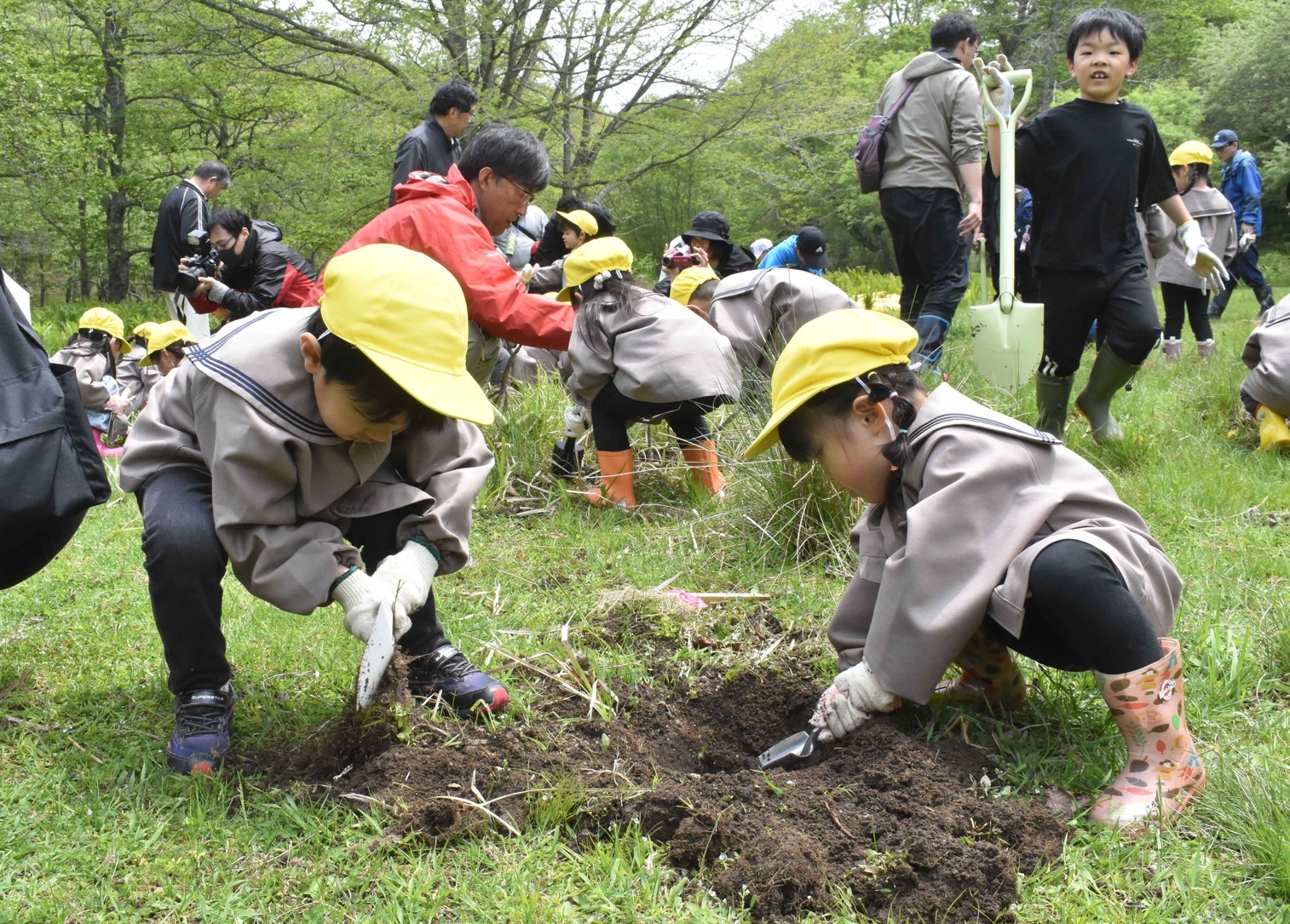 [写真/それぞれの持ち場で記念植樹を行う園児]