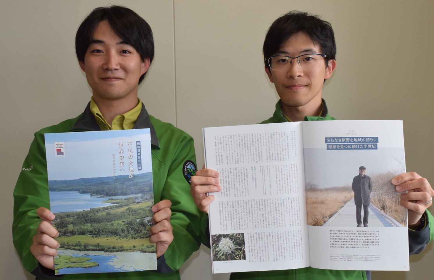 [写真/完成した冊子をPRする浅井さん(左)と釧路湿原自然保護官事務所の梶谷浩希さん]