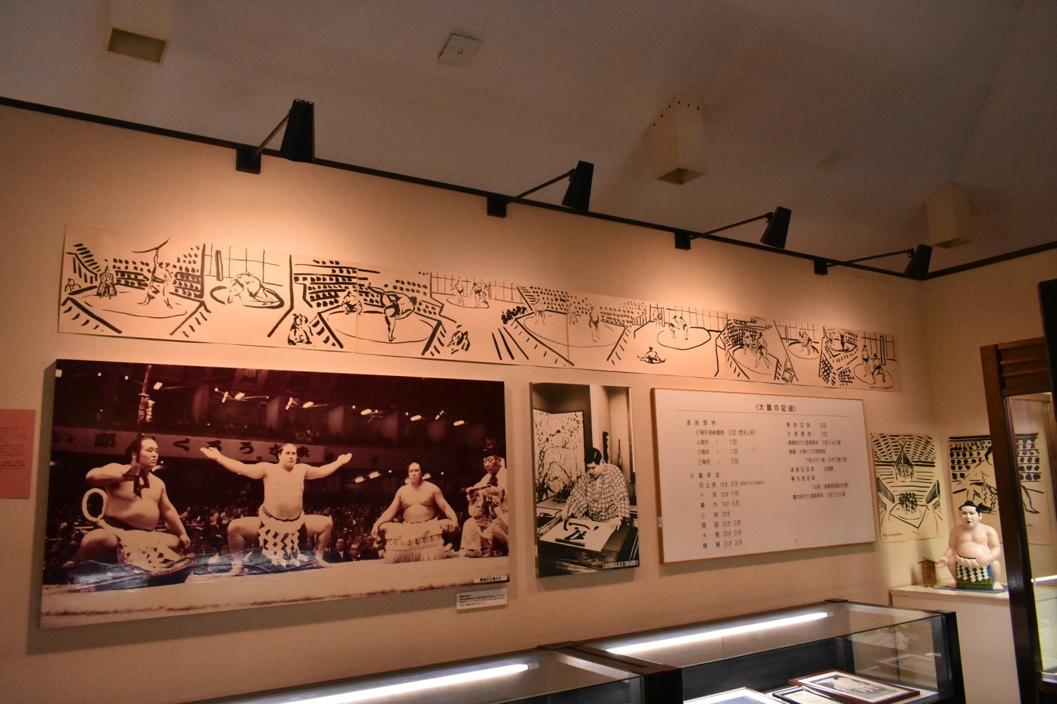 [写真/常設展示に溶け込むように、弓取りや取組、稽古の様子が描かれている]