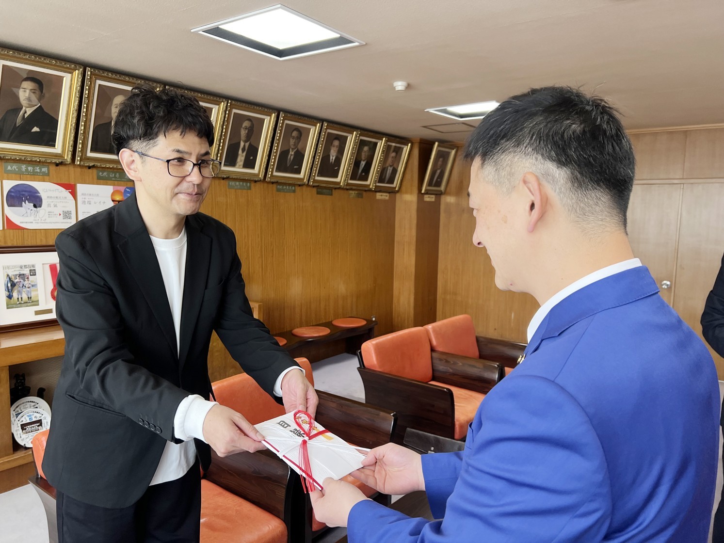 [写真/鶴間市長(右)に目録を手渡す石坂社長]