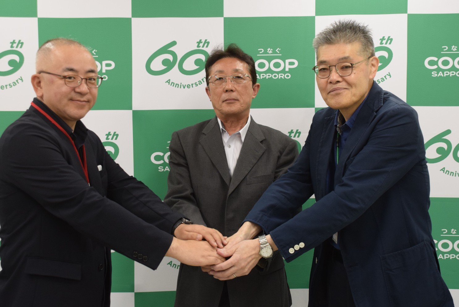[写真/がっちりと手を組む米内常務理事、吉田代表、コープトレーディングの高森雄輔社長(右から)]