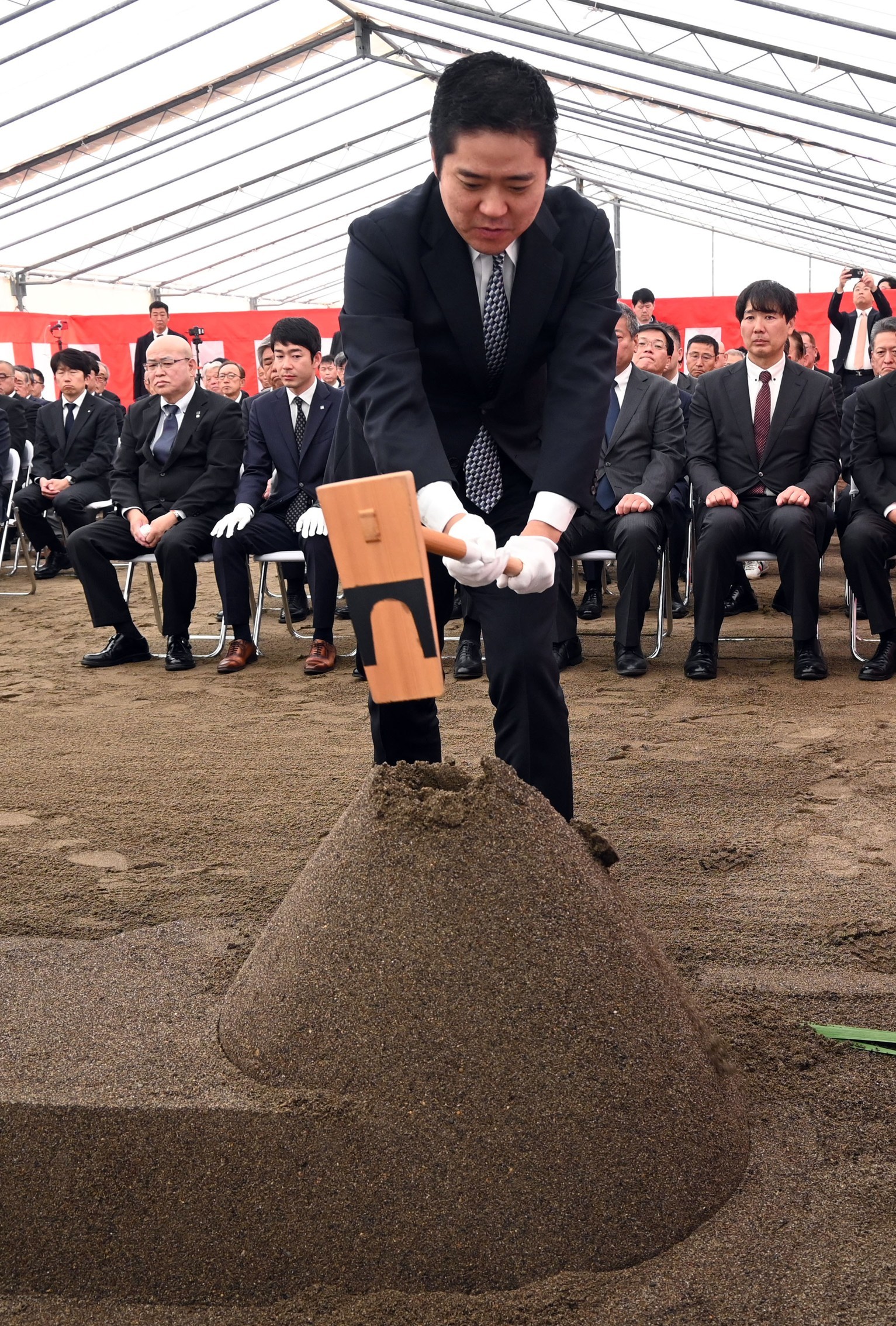 [写真/工事の安全を祈願し、くわ入れする佐野社長]
