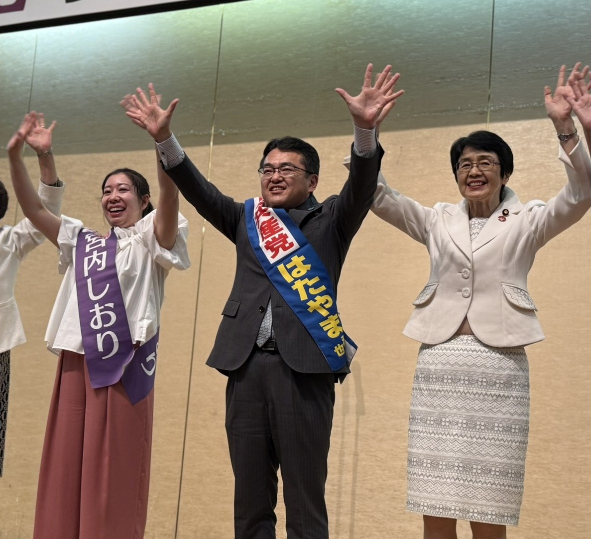 [写真/「目標は比例5議席」。畠山氏と並んで支援を訴える宮内氏(左)]