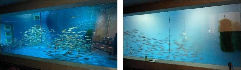 [写真/群来の再現の様子。実験開始(左)。産卵後はニシンの精子で水中が真っ白(右)に]