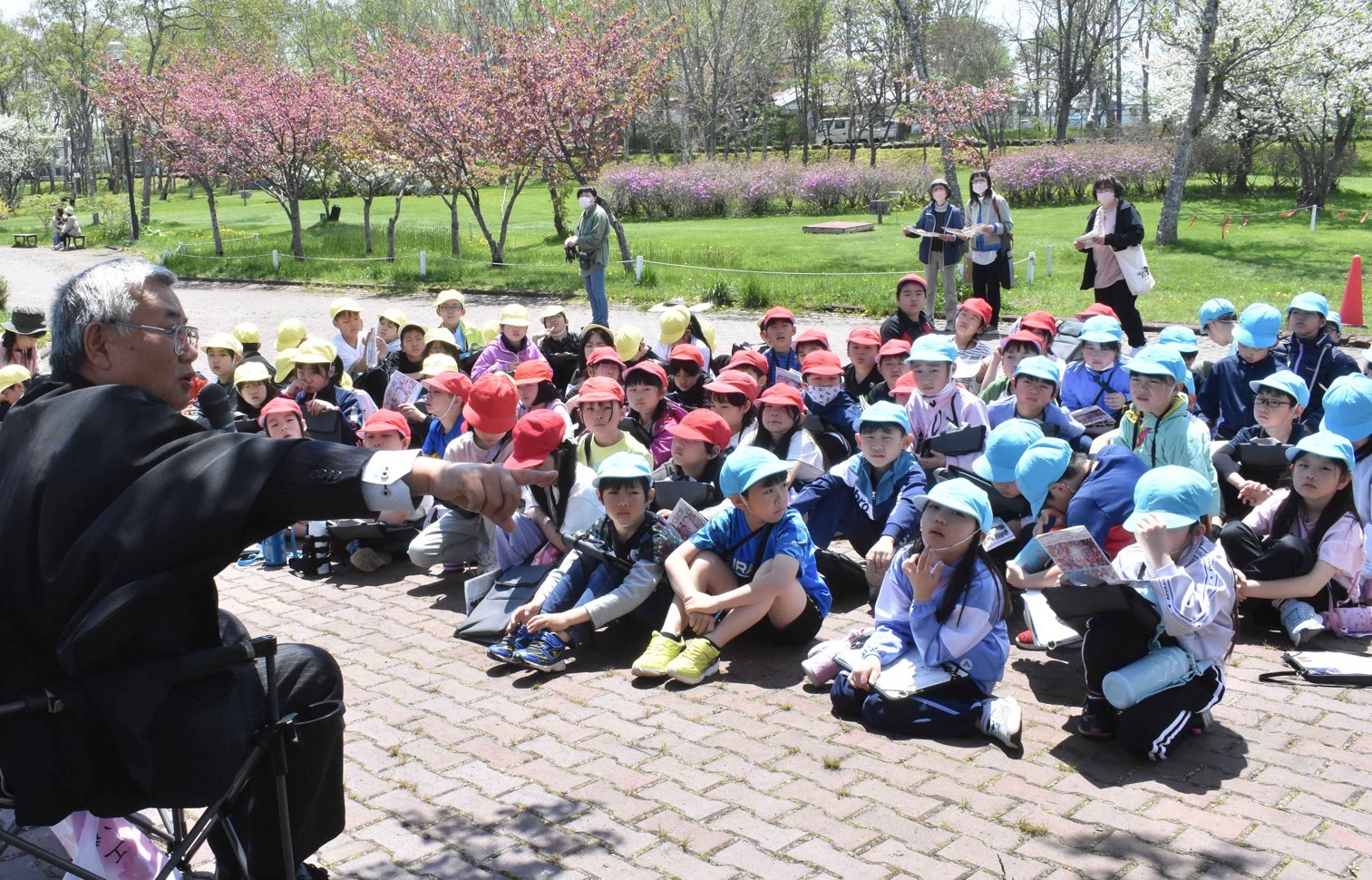 [写真/愛国小3年生に釧路の桜について語る下山さん(左)]