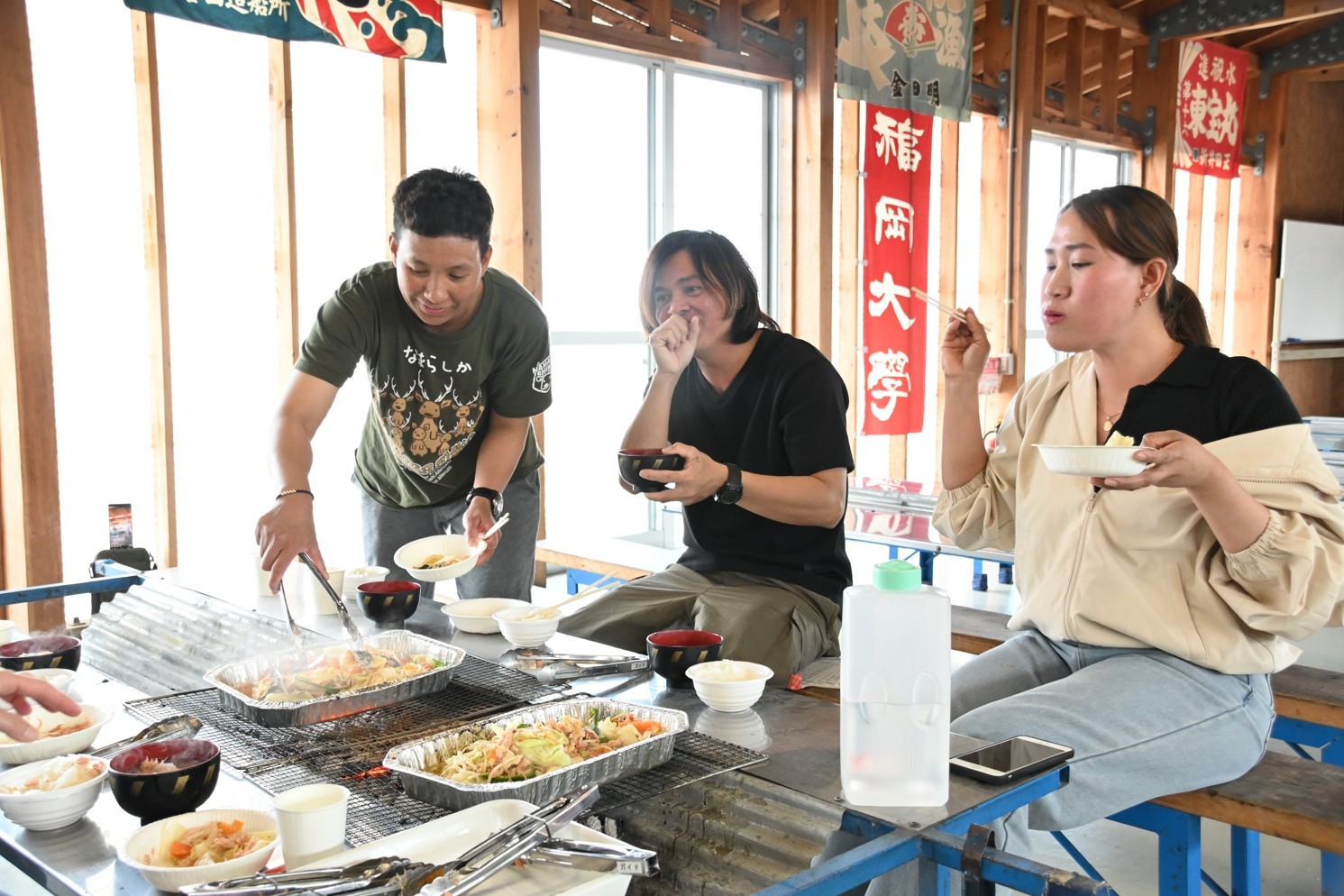 [写真/ちゃんちゃん焼きを味わう実習生]