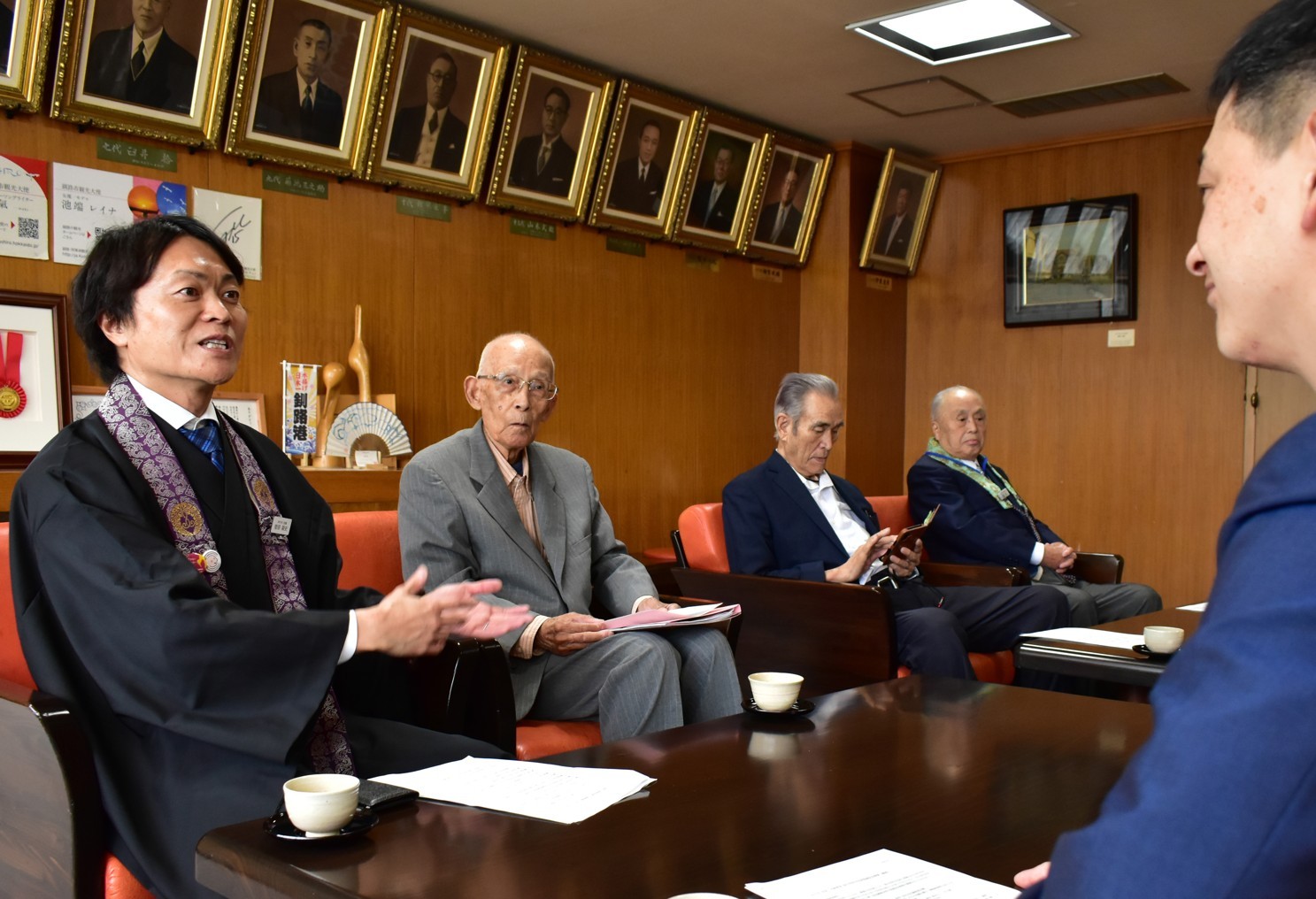[写真/記念事業について説明する(左から)菅原住職と北畠代表ら関係者]