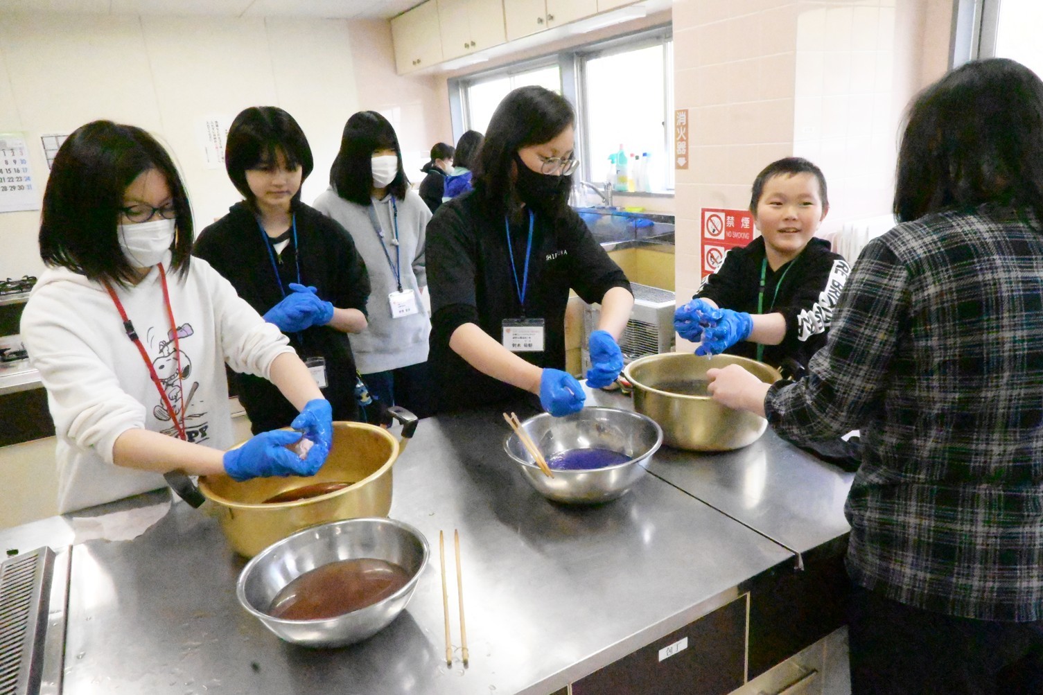 [写真/布染め作業を行う児童ら]