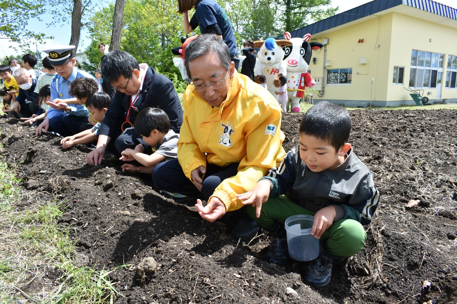 [写真/佐藤町長(右から2人目)や鈴木署長(同7人目)と種をまく園児たち]