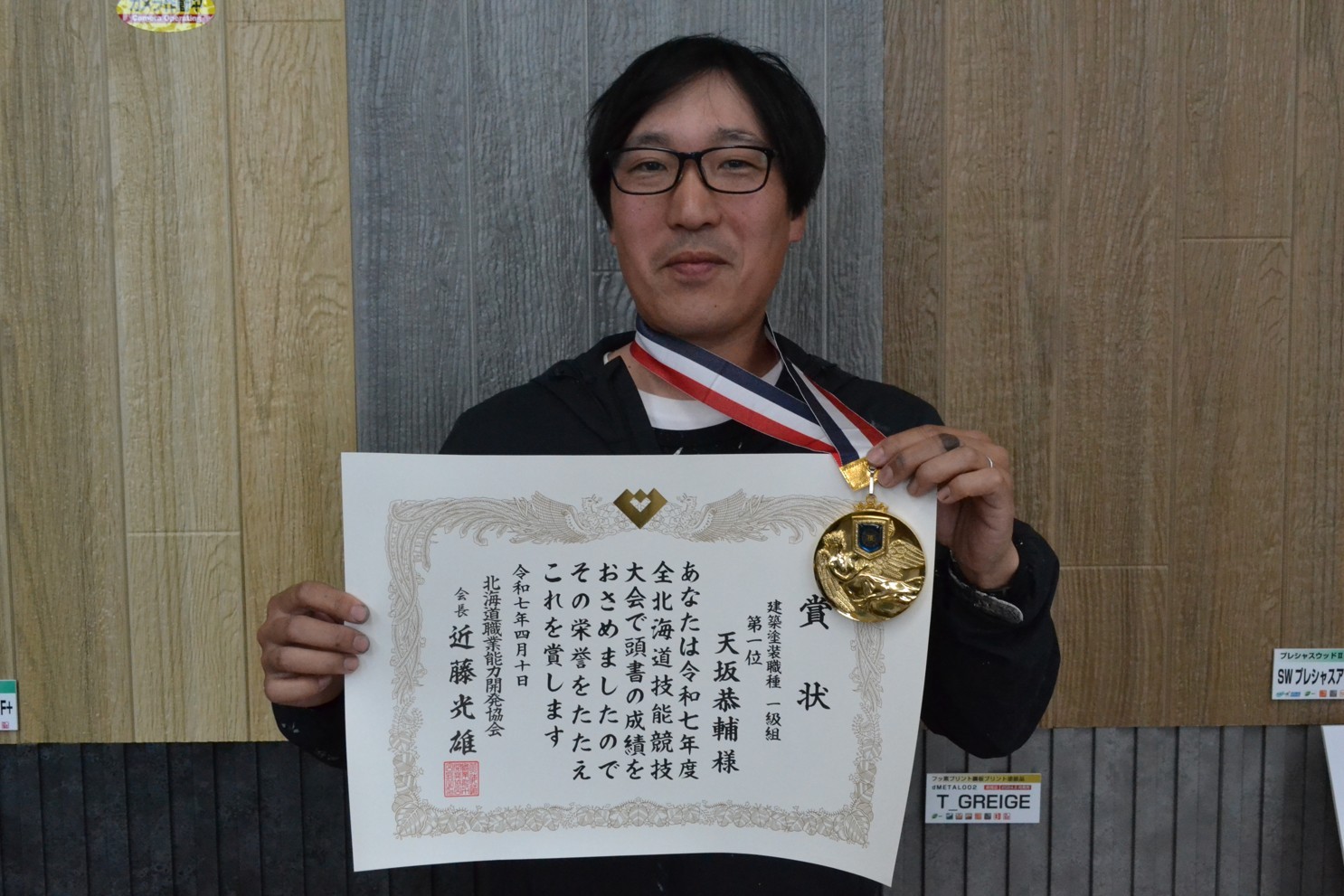 [写真/全北海道技能競技大会(建築塗装)で1位を獲得した天坂さん]