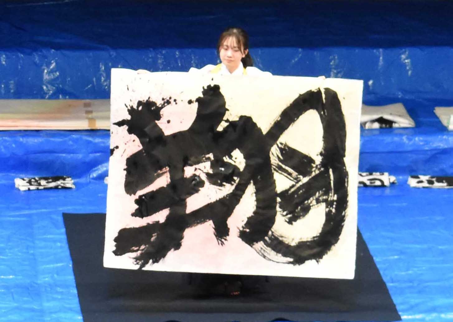 [写真/総文祭と今後への思いを込めて「翔」の文字を書き上げた柳沼さん]