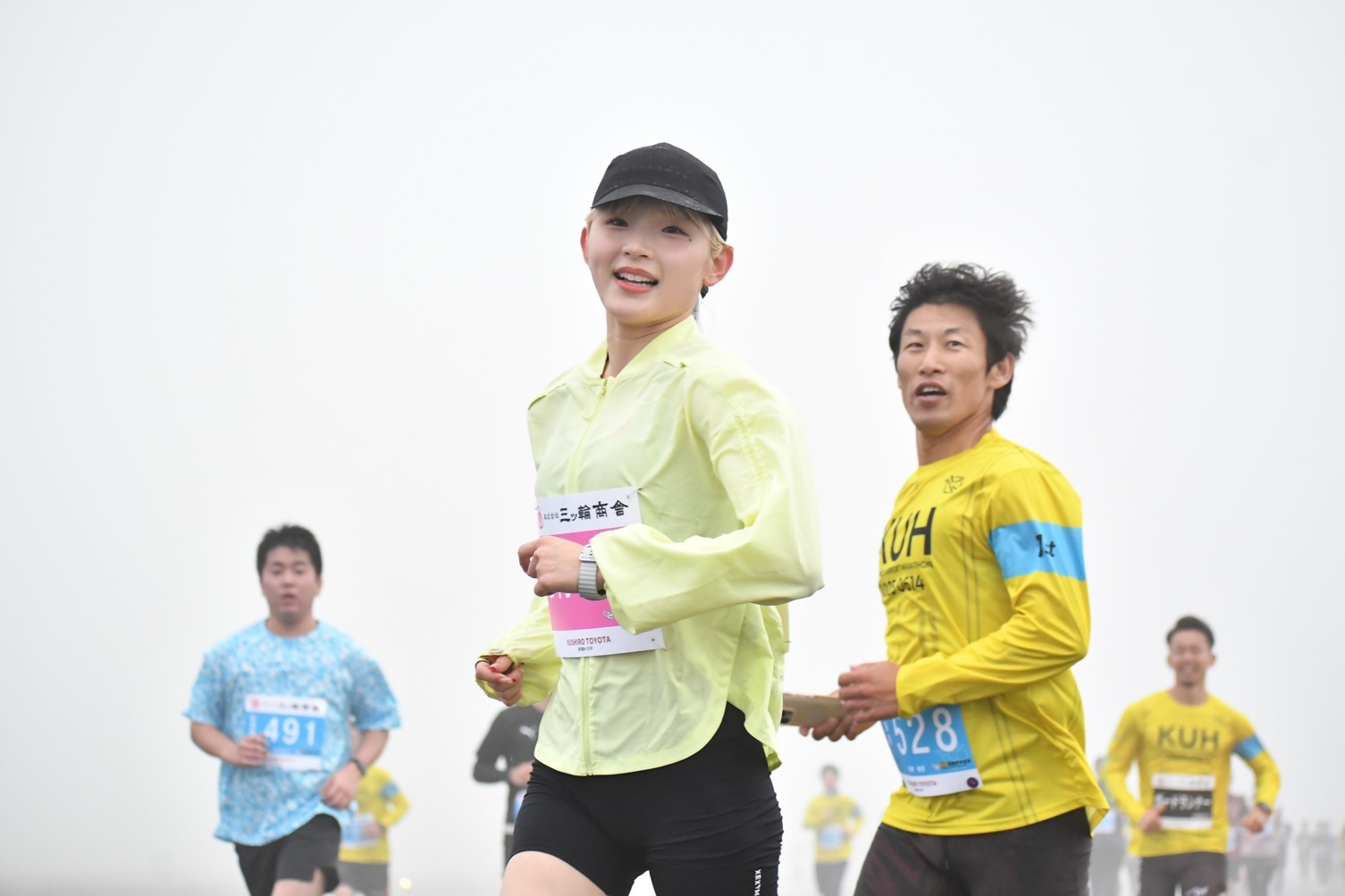 [写真/ゲストランナーとして大会を盛り上げた陸上インフルエンサーの志村美希さん。日本体育大学時代には800㍍で全国入賞を成し遂げた実績を持つ。今大会は最後尾から出発し、参加者の背中を押しながら軽快な足取りで10㌔を走破した]