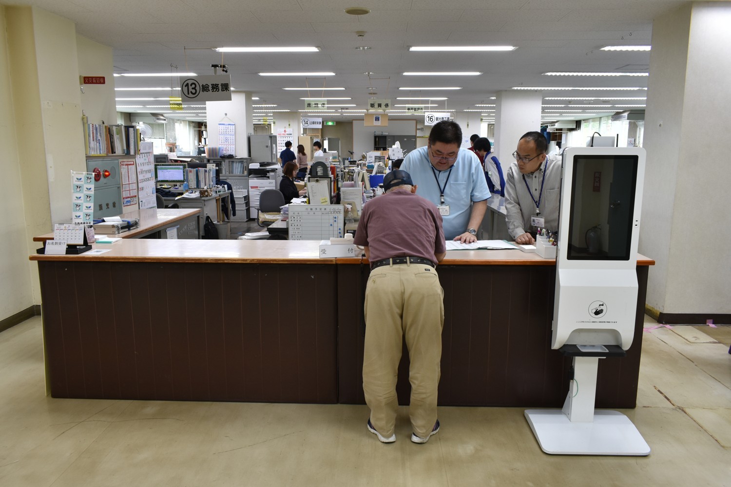 [写真/機構改革に合わせて設置された2階の総合窓口。各課、係のプレートは後日更新される]