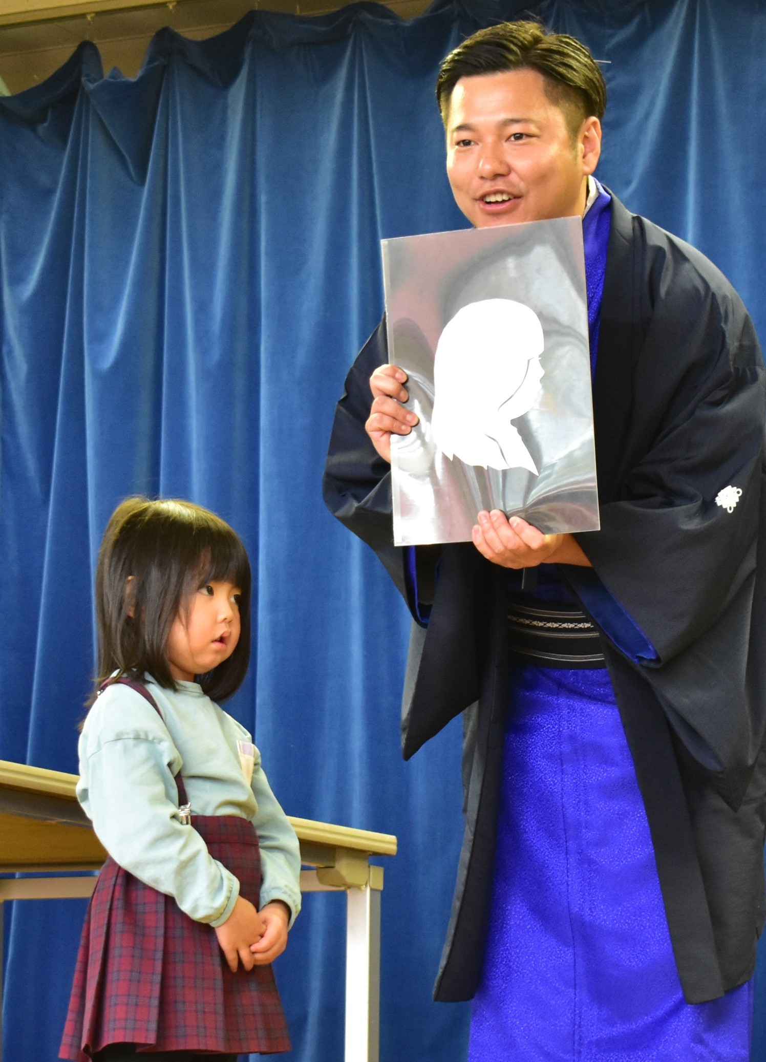 [写真/園児の横顔を切り絵で表現する林家楽三郎さん]