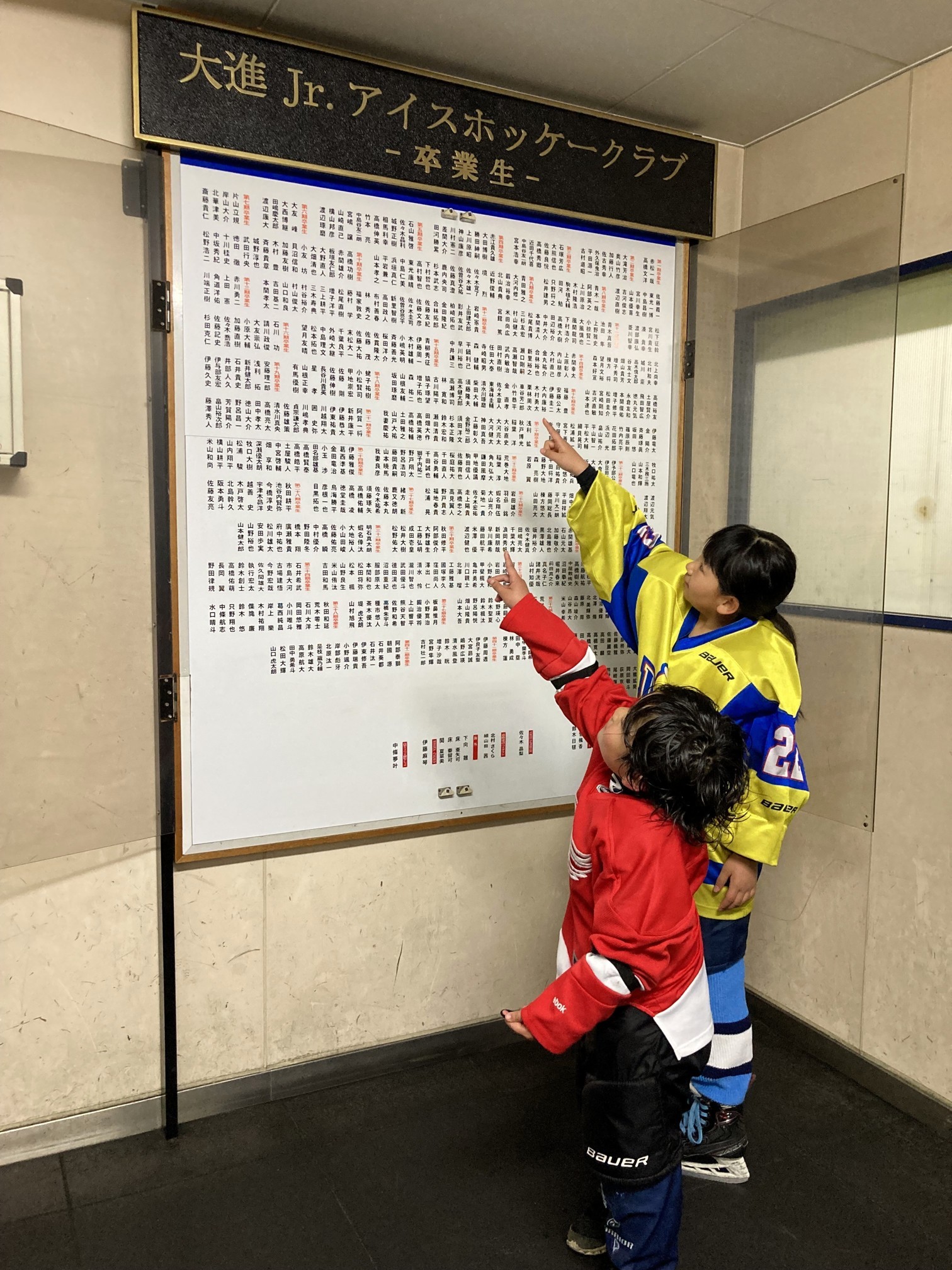 [写真/入り口にはジュニアの卒業生の名前が記載。日本代表やトップリーガーとなった選手の名前がずらりと並び、中島谷社長は「うちの歴史そのもの」と話す]