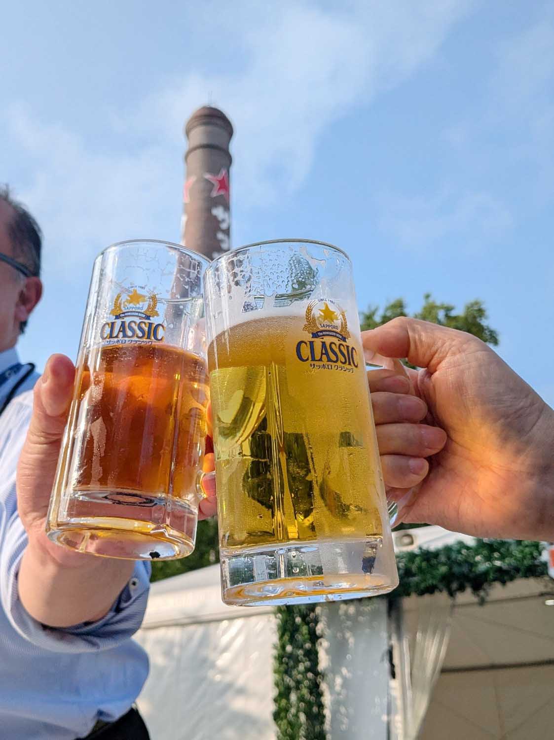 [写真/サッポロビール園の開拓使館煙突を背景にビールで乾杯]