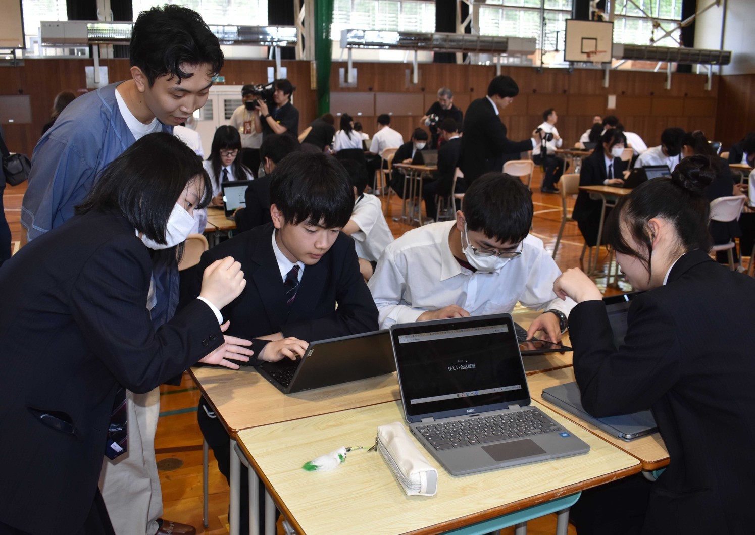[写真/今井さん(左から2人目)から指導を受けて協力しながらゲームを展開する生徒たち]