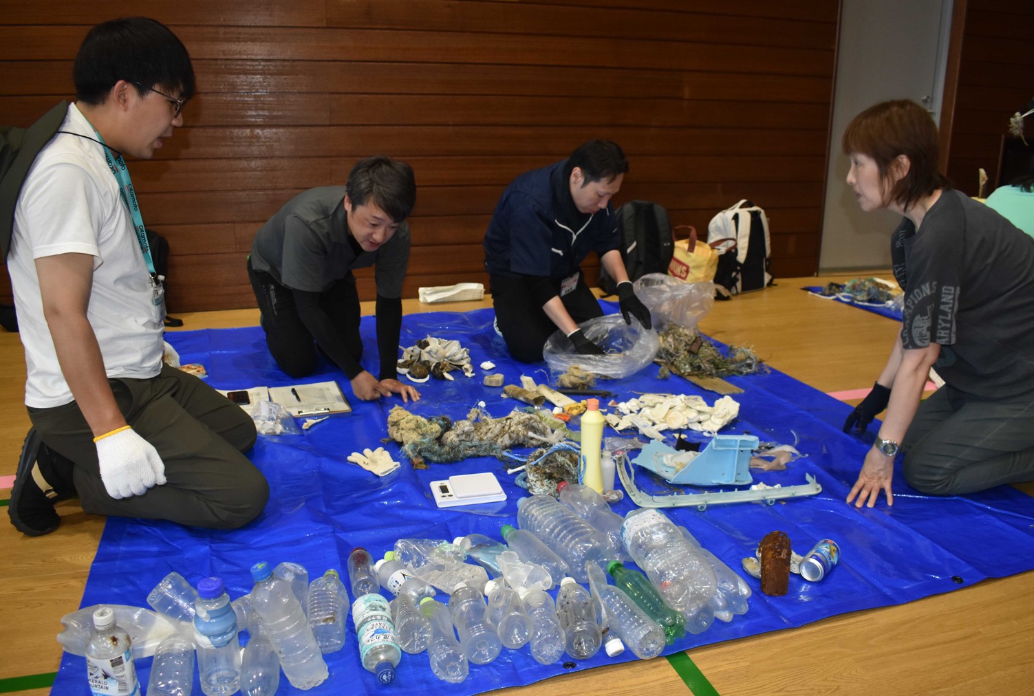 [写真/海岸での回収物を分類する参加者]