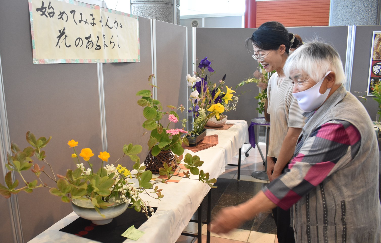 [写真/会員が生けた一輪花が並ぶ会場]