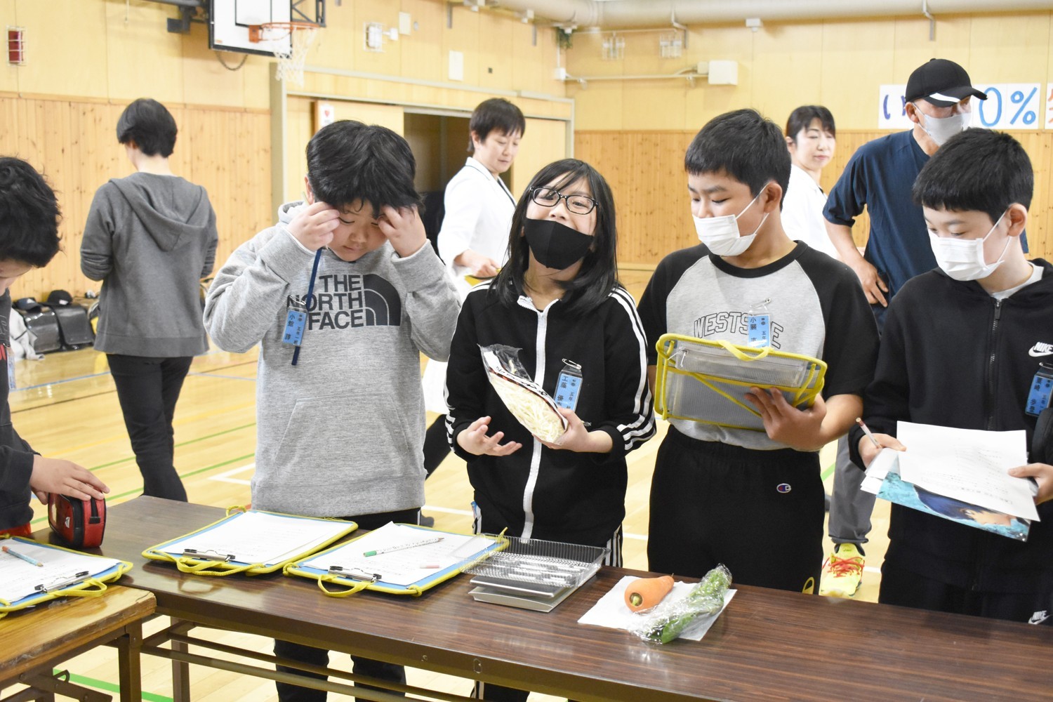 [写真/体に必要な野菜の重さを確認する児童たち]