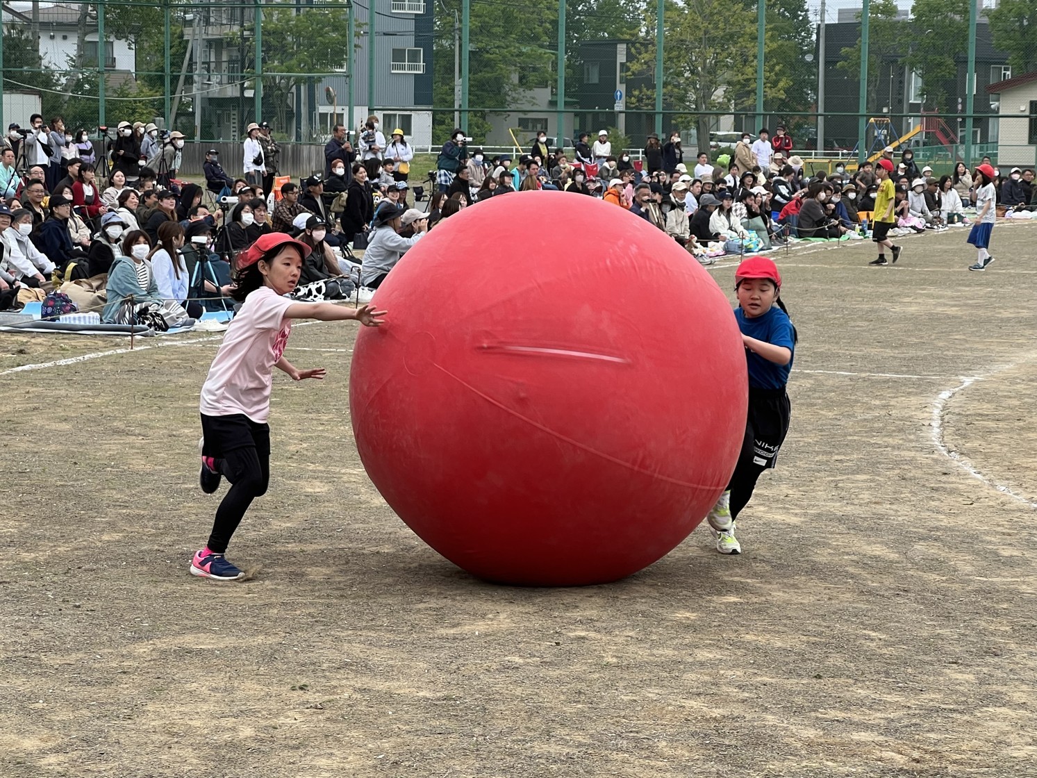 [写真/2人で協力して大玉を次の走者へとつなぐ、大玉リレー(14日、釧路市立中央小学校)]