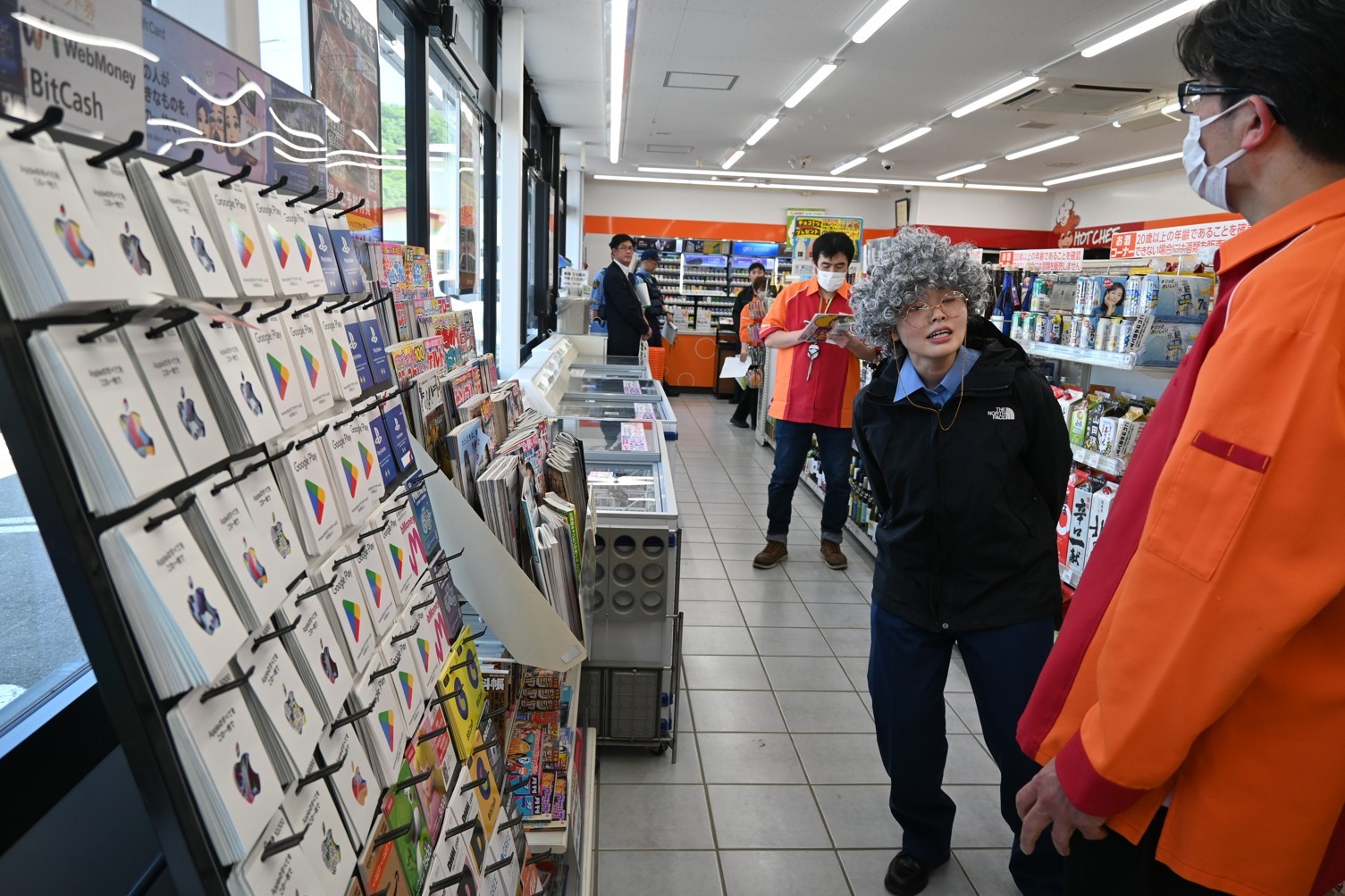 [写真/5万円のプリペイドカードを買おうとする高齢女性役の警察官の詐欺被害を疑い、購入をとどまらせようとする訓練]
