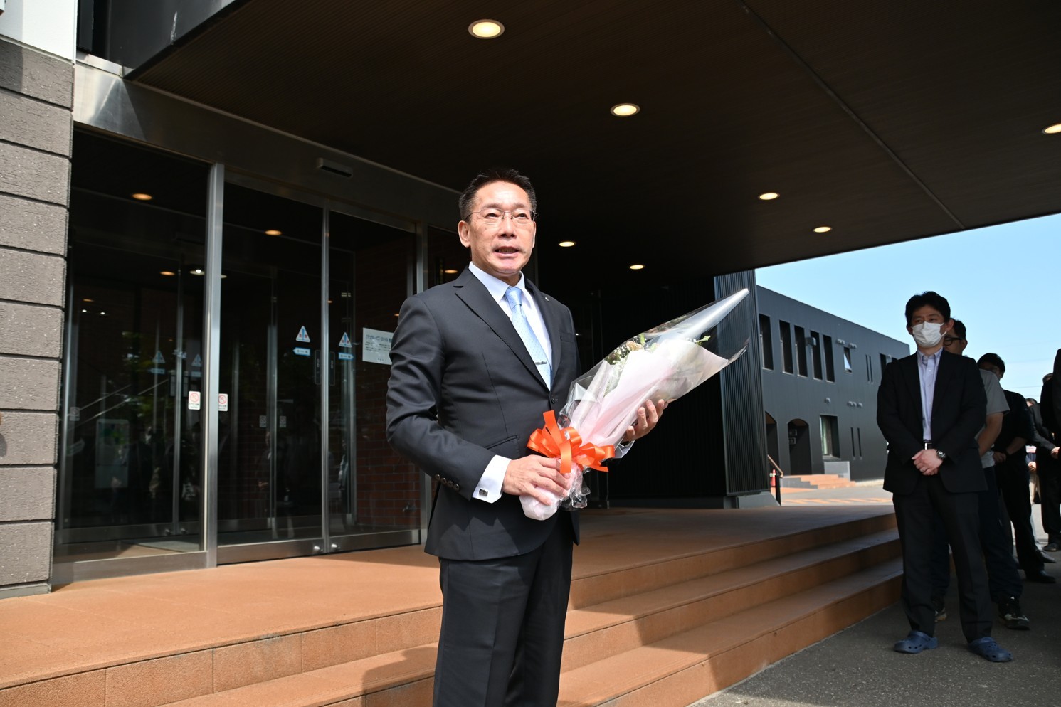 [写真/花束を受け取り、2期目をスタートさせた山口町長]