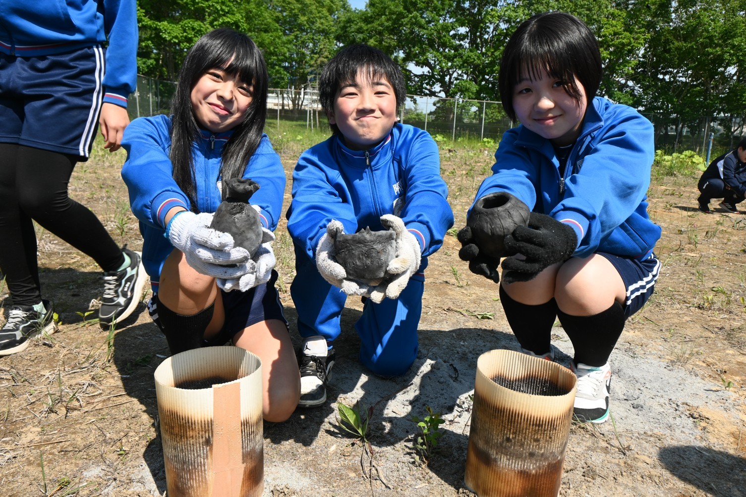 [写真/完成した土器を手に笑顔を見せる児童ら]
