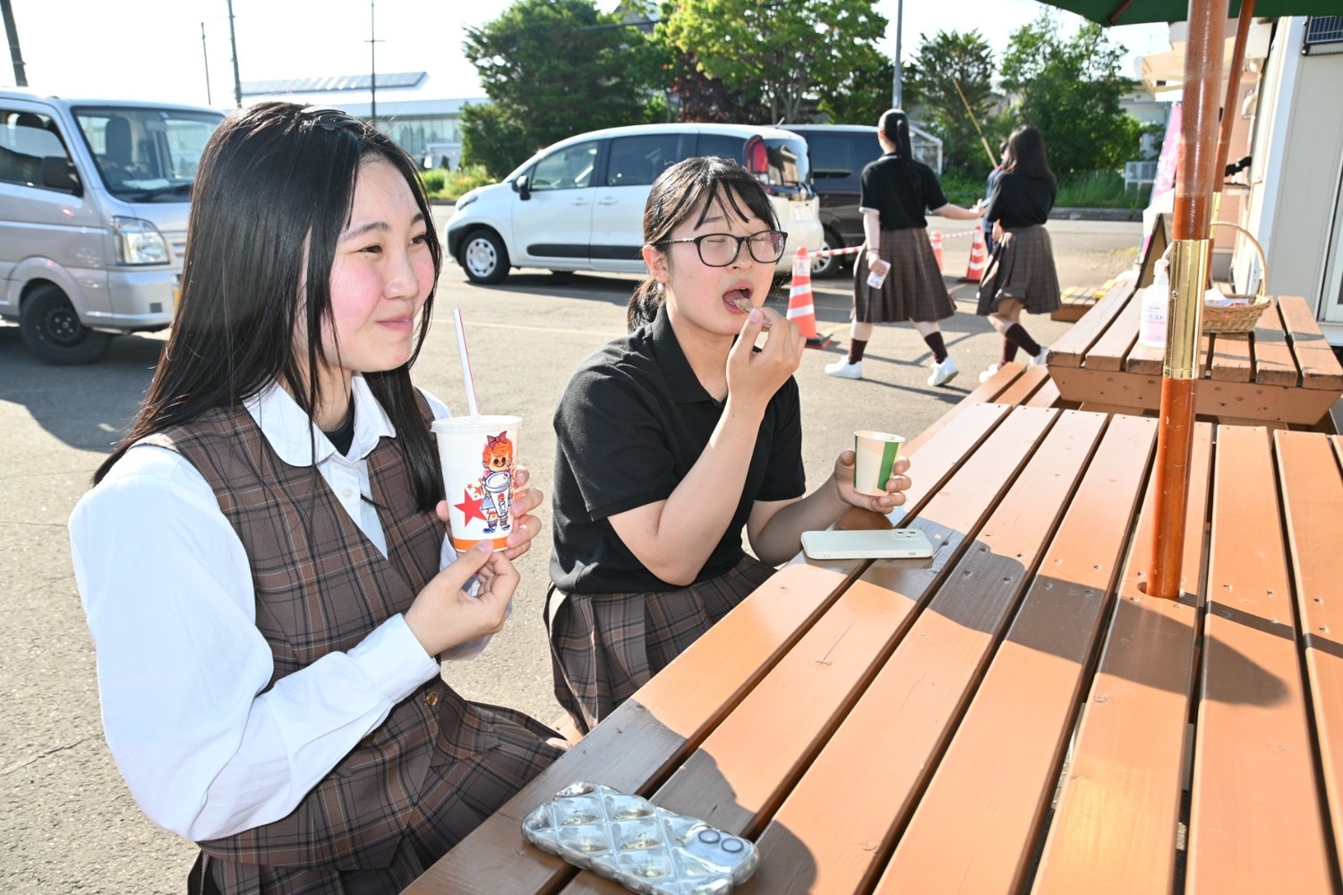 [写真/冷たいスイーツで暑さをしのぐ高校生(別海町内午後4時ごろ、橋本梓撮影)]