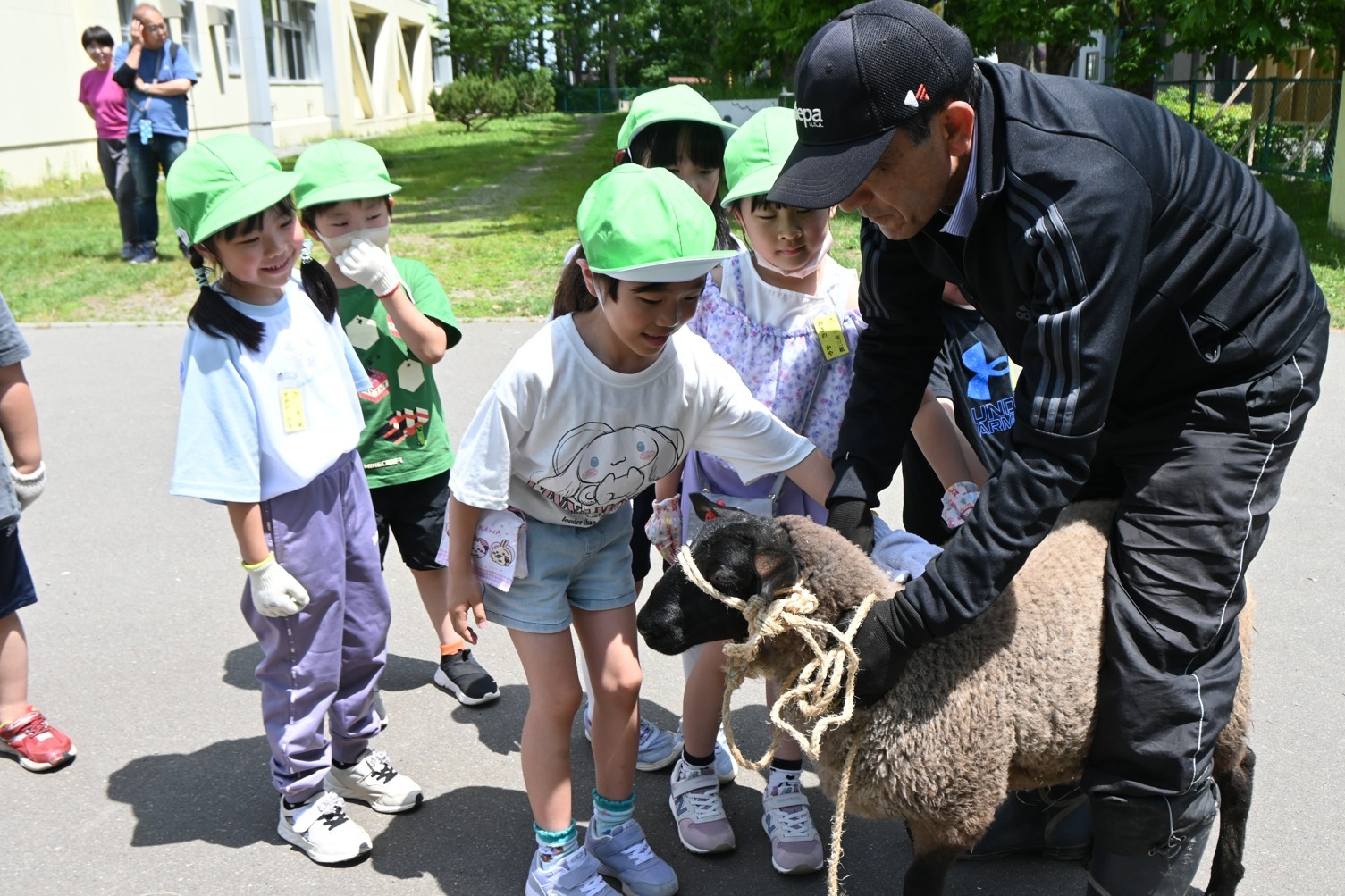 [写真/羊と笑顔で触れ合う児童ら]