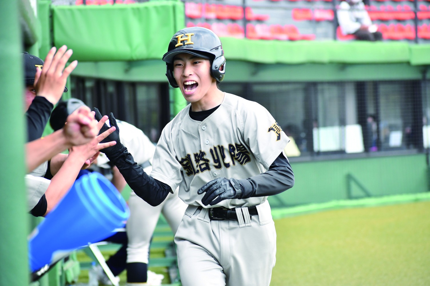 [写真/【Bブロック準決勝、釧北陽─武修館】初回に先制の適時三塁打を放った釧北陽の本間。自身も生還し、ベンチの仲間とハイタッチ。結果的に5打数3安打3打点の大暴れ]